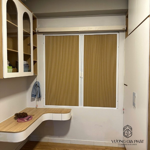 • Rèm tổ ong 2 lớp: lớp ngoài màu kem sáng, lớp trong phủ bạc cách nhiệt.