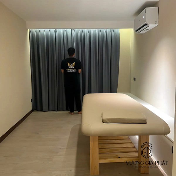 Sau khi hoàn thành có thể thấy được hiệu quả thẩm mỹ và công năng mà rèm vải 2 lớp màu xám. Mang lại cho không gian spa. Sự thay đổi này đã góp phần nâng cao trải nghiệm của khách hàng