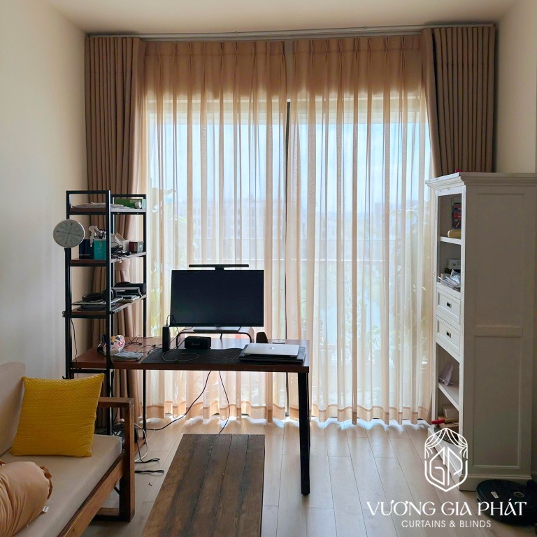 - Lựa chọn loại rèm và chất liệu: Khách hàng chọn mẫu rèm vải dày màu be sữa chống nắng và voan trắng trơn mềm mại. Chất liệu được nhập khẩu, có khả năng chống phai màu, cản sáng lên đến 95%. Thân thiện với môi trường.