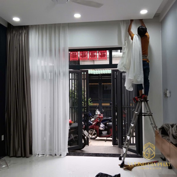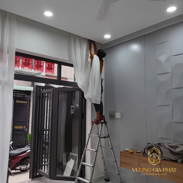 - Bước 3 Lắp đặt rèm & căn chỉnh: Treo rèm vải 2 lớp tại các vị trí đã xác định, điều chỉnh độ rủ tự nhiên. Lắp đặt rèm cầu vồng gọn gàng, đảm bảo vận hành mượt mà.