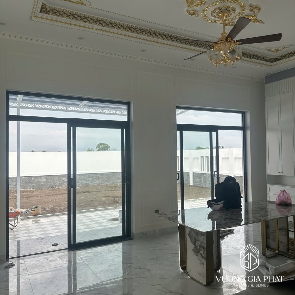 Khảo sát và tư vấn: Đội ngũ kỹ thuật đến biệt thự Gò Công. Đo đạc kích thước cửa chính, cửa sổ, phòng chức năng. Phân tích nhu cầu: cần vừa sang trọng (phòng khách), vừa tiện lợi (phòng bếp).