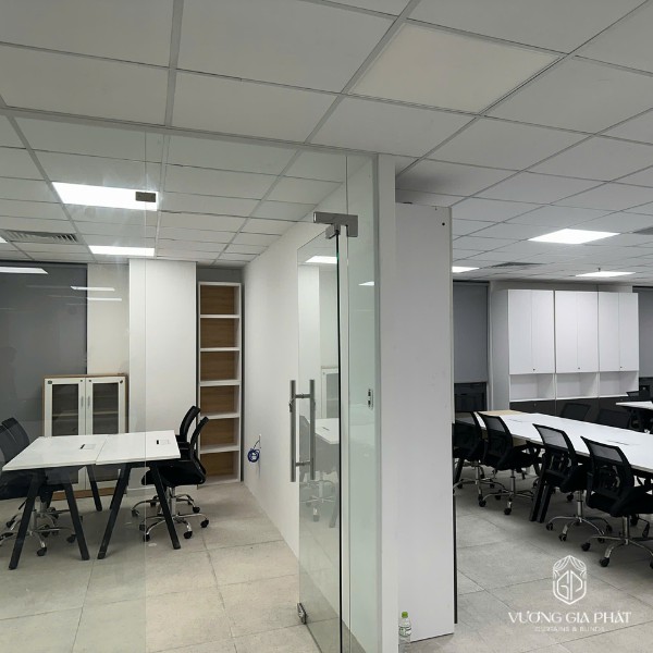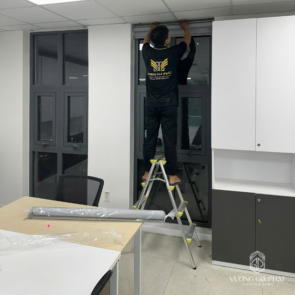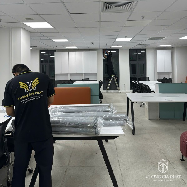 - Thi công lắp đặt: Đội ngũ thi công bắt đầu triển khai lắp đặt theo đúng yêu cầu kỹ thuật. Quá trình thi công được tiến hành trong giờ hành chính, không ảnh hưởng đến hoạt động của nhân viên văn phòng. Mỗi bộ rèm được cân chỉnh đều, không lệch trục, tạo sự đồng bộ cao.