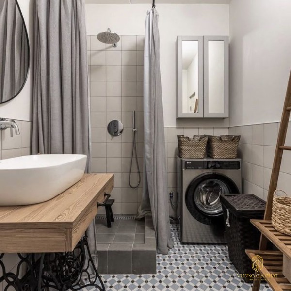 - Rèm vải họa tiết che bồn cầu: Treo từ trần xuống sàn, có thể mở kéo linh hoạt. Che kín hoàn toàn khu vực bồn cầu, thêm họa tiết thể hiện phong cách. Tạo cảm giác phòng tắm riêng biệt hơn.