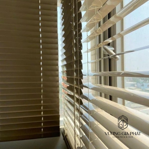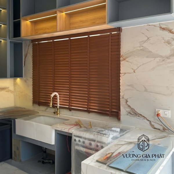 - Rèm sáo gỗ màu tự nhiên: Tạo cảm giác ấm cúng, sang trọng.