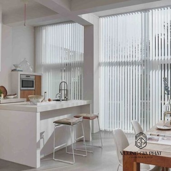 - Rèm Lá Dọc: Loại rèm này thích hợp với cửa sổ lớn trong phòng bếp. Khả năng điều chỉnh ánh sáng linh hoạt và dễ vệ sinh. Giúp rèm lá dọc được nhiều người ưa chuộng.