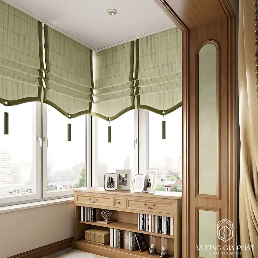 - Rèm cuốn Roman: Kết hợp tính năng cuốn, phù hợp với không gian làm việc hoặc phòng học.