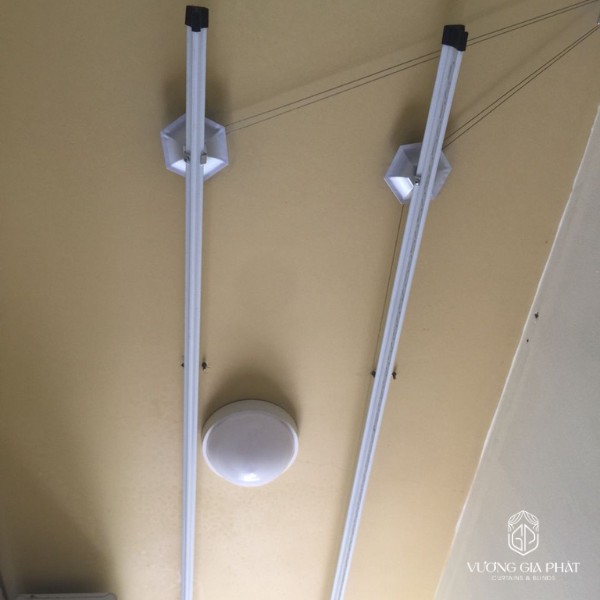 - Bước 3: Nâng giàn lên Sau khi treo xong, quay ngược lại để nâng giàn lên cao. Giàn sẽ ép sát trần, tạo sự gọn gàng và an toàn.