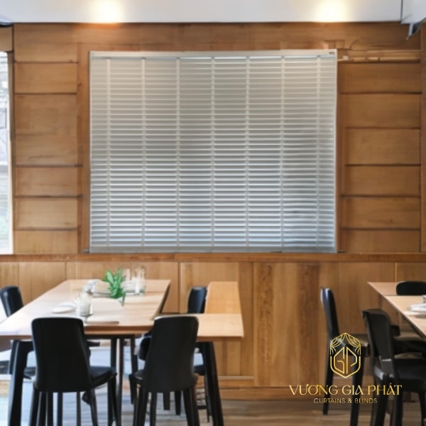 Trong không gian kinh doanh, rèm sáo gỗ mang lại sự thoải mái, dễ chịu cho khách hàng. Với khả năng điều chỉnh ánh sáng linh hoạt, sản phẩm này giúp tạo không gian phù hợp với mọi thời điểm trong ngày. Đồng thời tăng thêm phần sang trọng cho quán.