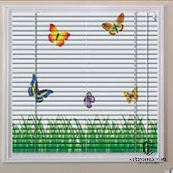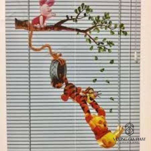 - Rèm sáo nhôm màu trắng dán tranh: Tạo điểm nhấn độc đáo cho phòng khách. Có thể lựa chọn tranh phong cảnh, tranh nghệ thuật hoặc tranh theo sở thích cá nhân. Vừa có tác dụng che chắn ánh sáng, vừa mang tính thẩm mỹ cao