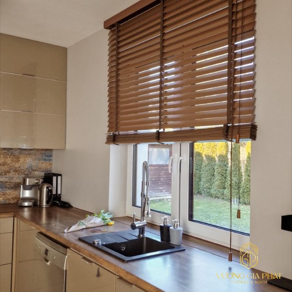 Tuyệt đối nên chọn rèm sáo nhựa giả gỗ. Môi trường này đầy dầu mỡ, hơi nước và ẩm thấp. Rèm nhựa sẽ không bị bám mùi, không mốc và cực kỳ dễ lau chùi.